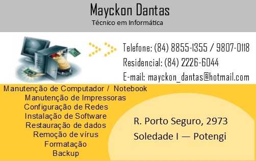 A ASSEJUF/RN firmou parceria com o profissional de informática Mayckon Dantas (Técnico em Informática). Através da parceria o sócio terá a comodidade de ligar para o profissional e solicitar visita técnica em sua residência/escritório. O profissional oferece os seguintes serviços: Manutenção de Computadores/Notebook; Manutenção de Impressoras; Configuração de Redes; Instalação de Software; Restauração de Dados; Remoção de Vírus; Formatação; Backups, dentre outros.